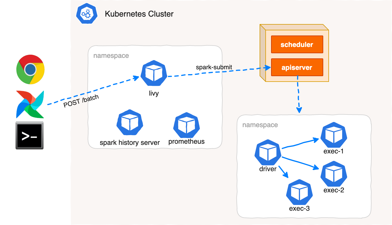 The basic Spark on Kubernetes setup consists of the only Apache Livy server deployment, which can be installed with the Livy Helm chart.