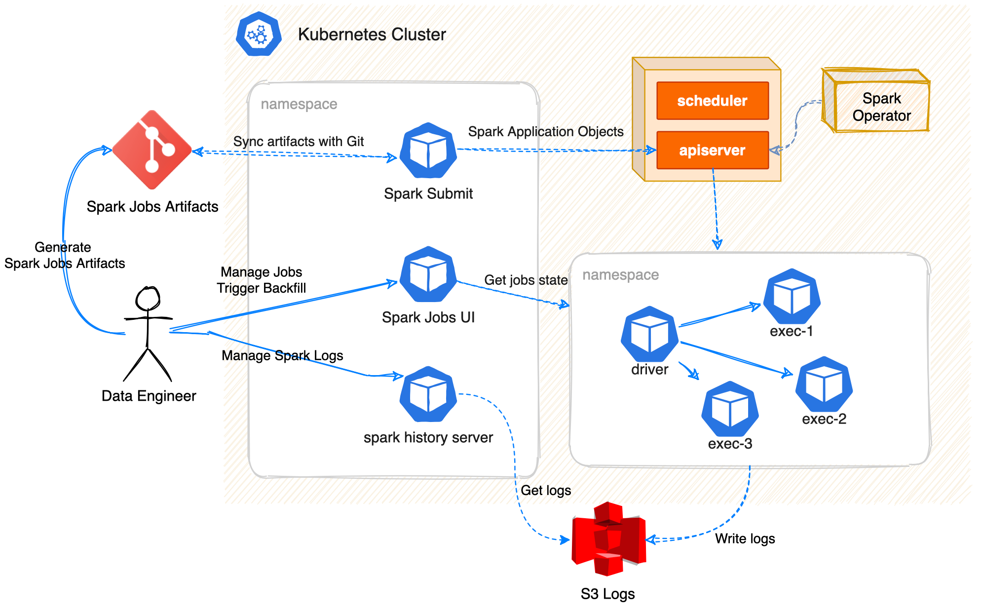 SparkApplicationSpark Operator sẽ dựng một POD driver, POD driver sẽ request thêm từ Kubernetes để dựng thêm các POD executor, đến khi nào Spark Jobs thực hiện xong sẽ tự động terminate các pod này. Logs sẽ được lưu giữ ở S3 bucket. - (4) Spark History Server sẽ render logs từ S3 bucket, giúp team engineer dễ dàng hơn trong việc traceback lại các jobs cũ đã finish.