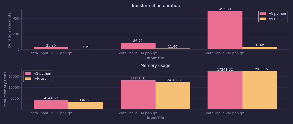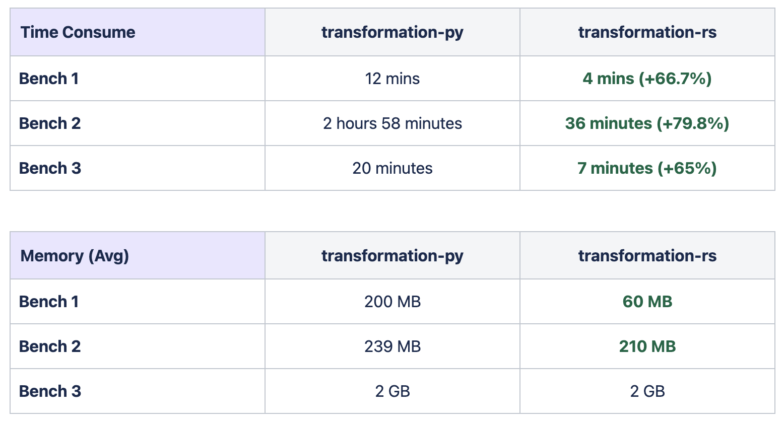 The image above displays the recent benchmark results by Hieu of Data Platform v3 (Python) vs v4 (Rust) in terms of processing time and memory usage. Rust outperformed Python by achieving a 490% faster processing time while maintaining the same memory usage. It's worth noting that Arrow was used as the data layout format during the benchmark. Based on this benchmark, the team started optimizing memory usage to further improve the performance of the Data Platform.