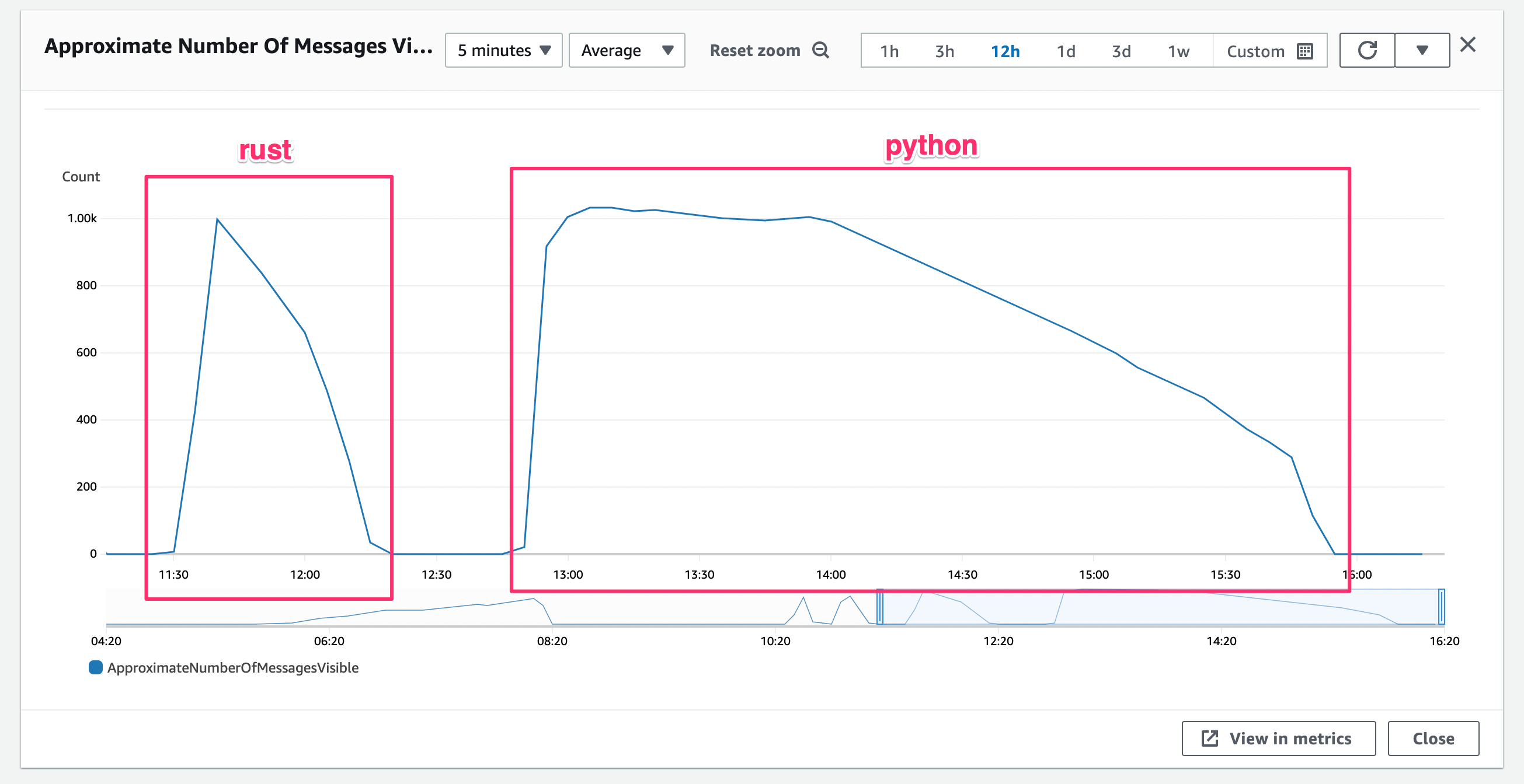 After comparing the two components in the real environment, Rust processes messages faster and consumes more messages than Python.